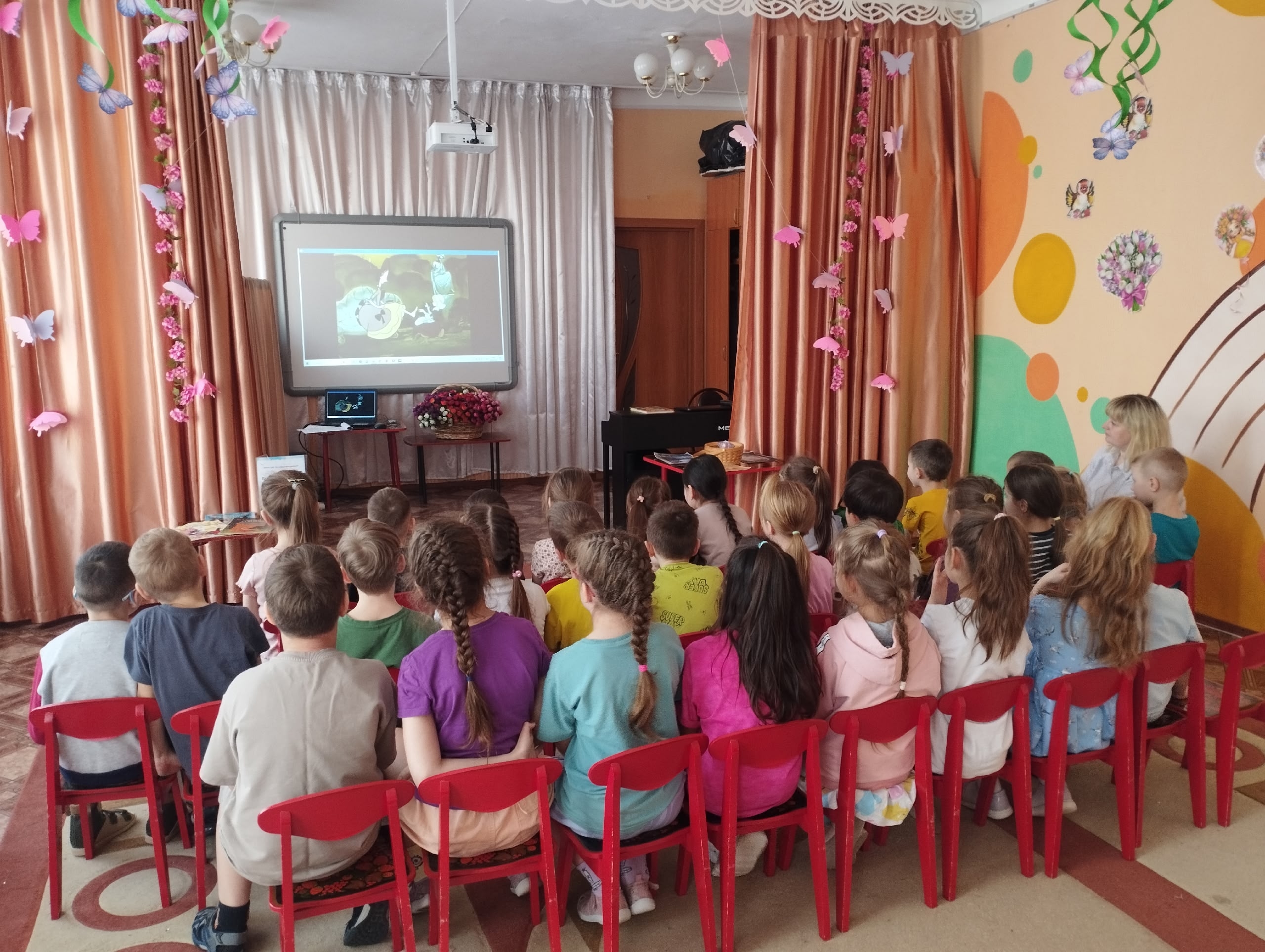 Дружно посмотрели фрагменты мультфильмов, узнавая знакомые сюжеты на экране.