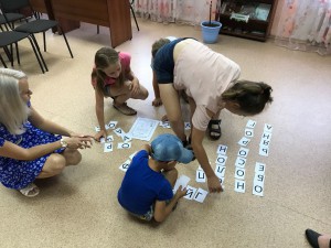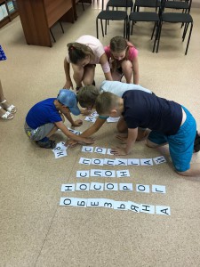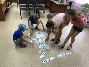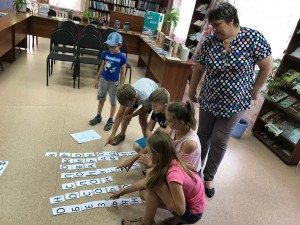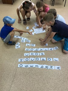 Далее детям предложили  из букв выложить ответы на кроссворд прямо на полу библиотеки. Это очень всех заинтересовало!  С восторгом они ринулись отгадывать задание.