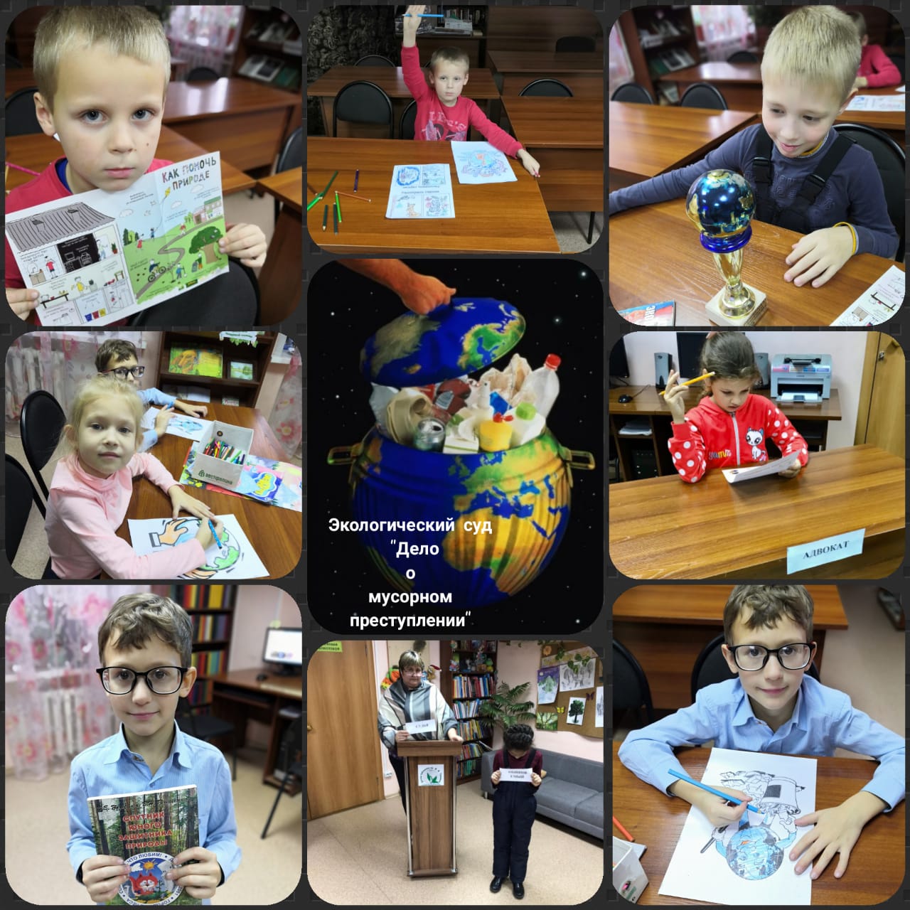 23-го октября, в библиотеке им. М. М. Пришвина прошел  экологический суд под названием «Дело о мусорном преступлении». Ребятам были приведены факты о катастрофическом вреде мусора, прошла викторина в виде презентации «Экологические ситуации», где ребята смогли понять как правильно себя вести, чтобы не навредить нашему дому — Земле. В конце мероприятия  библиотекарями и детьми было разыграно судебное дело, в котором обвиняемый «человек» был приговорен к «исправительным работам», т. е. по возможности исправлять свои ошибки, приносящие столько вреда окружающей среде! А еще, каждому из наших гостей, было предоставлено слово-обращение к жителям нашего города о просьбе уменьшить количество выбрасываемого бытового мусора.