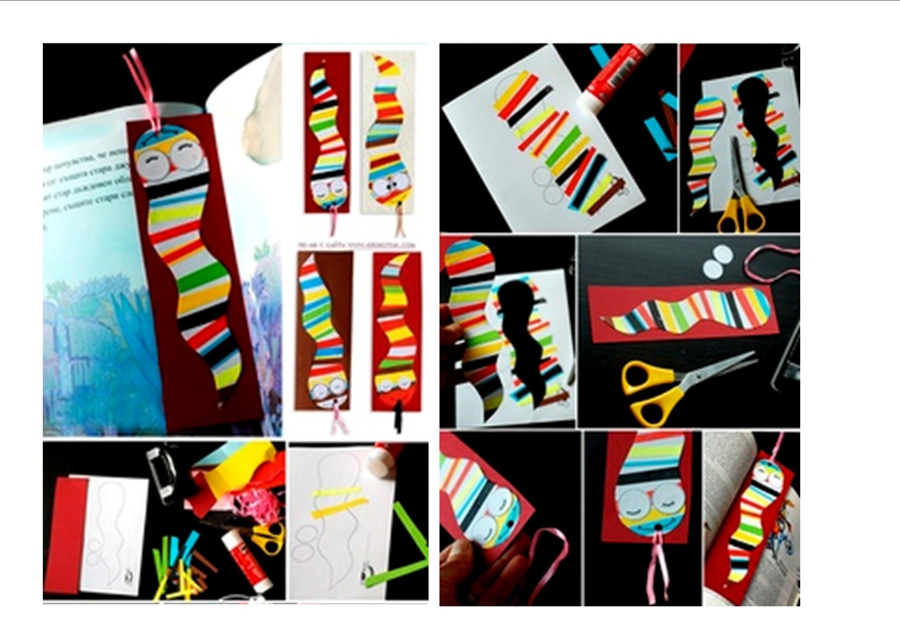 Как сделать: Сперва нарисуйте шаблоны, к примеру, тот, что есть на фото. Затем подготовьте все остальные материалы. Наклейте разноцветные полосочки поверх шаблона. Теперь можно вырезать червячка. Приклейте его на полоску картона, который будет основой закладки для ваших книг. При помощи дырокола сделайте одно отверстие в области головки червячка, эта дырочка понадобится для того, чтобы потом привязать ленту. Приклейте глазки, закрепите ленточку. Вот и все, простая и оригинальная поделка из цветной бумаги уже готова.